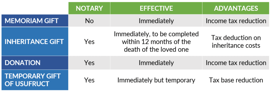 If you would like more information on the different types of donation, their specific features and legal conditions, please do not hesitate to contact us.