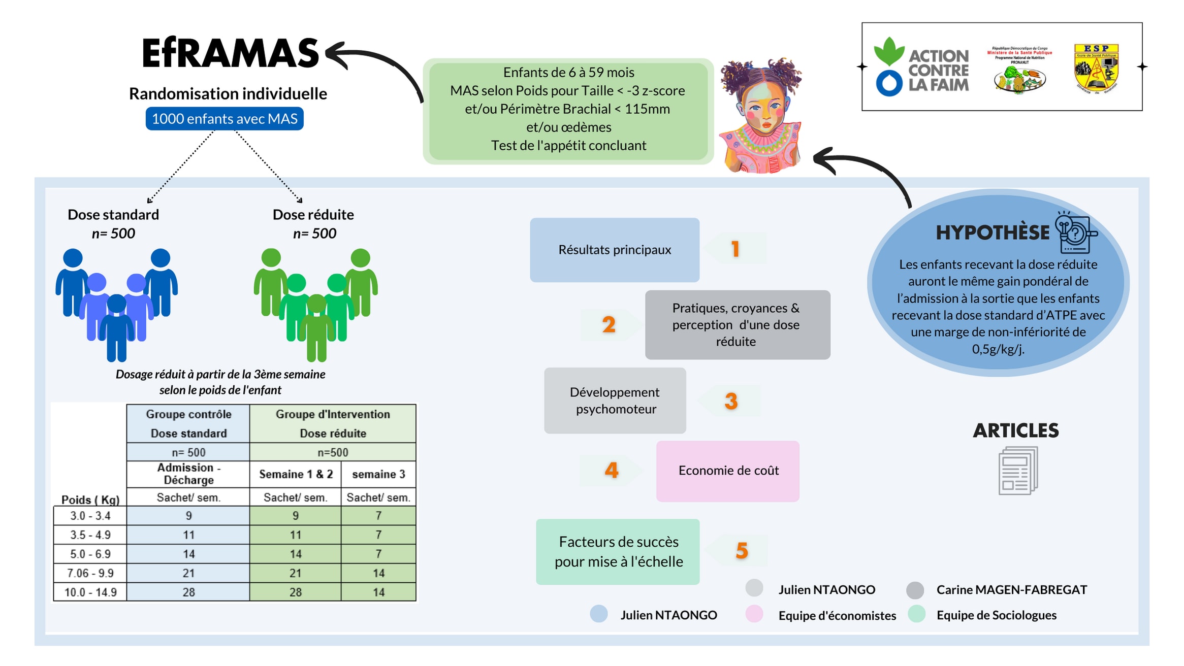 Il était difficile de transposer le succès de ce traitement avec une dose réduite à des contextes beaucoup moins favorables. En 2021, le projet de recherche EfRAMAS a été lancé en RDC pour vérifier si on obtient ces mêmes résultats dans une situation d’insécurité alimentaire et sans personnel supplémentaire pour collecter les données, ce qui reflète la pratique courante des soins.